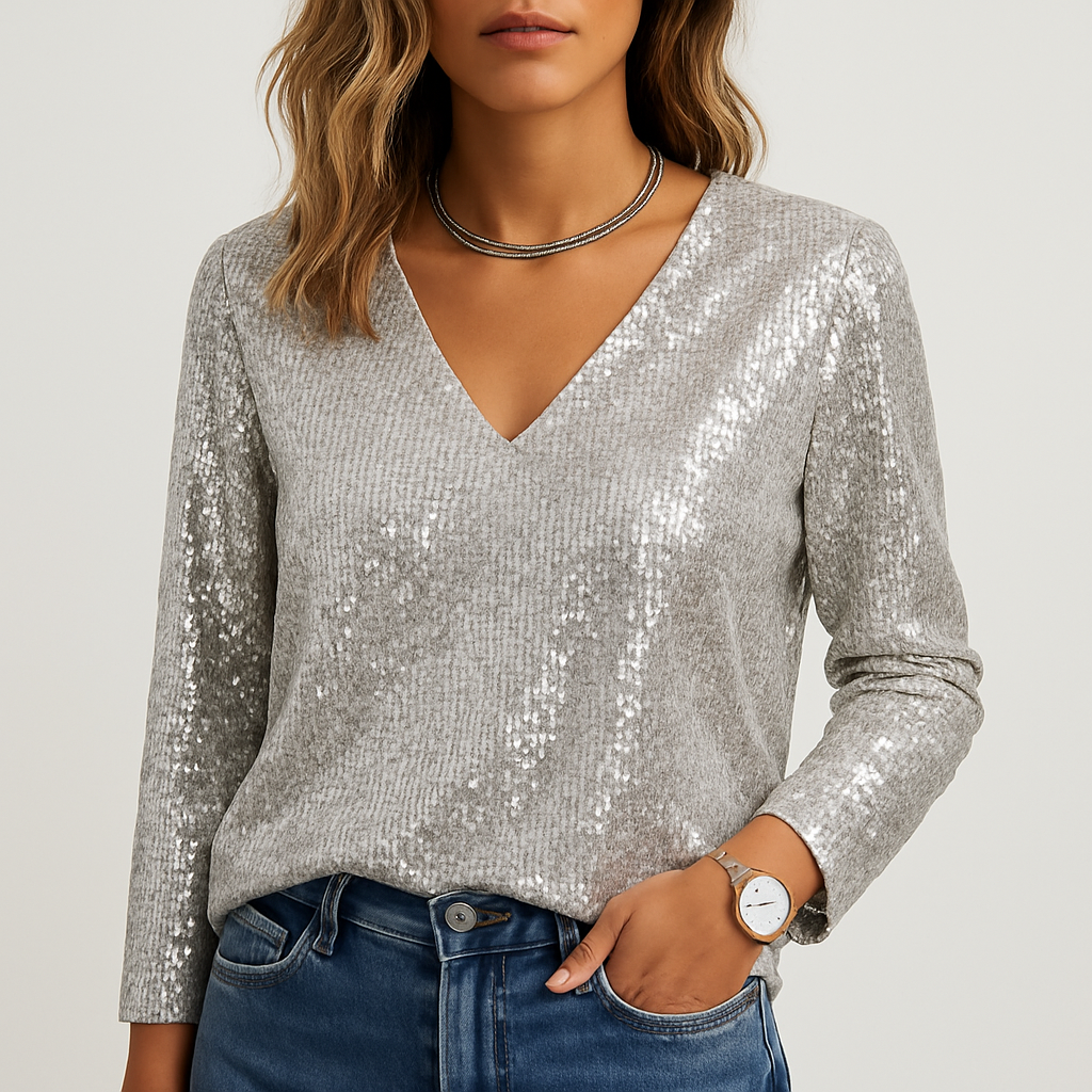Yindi is een betoverend topje dat glamour en verfijning samenbrengt. De glinsterende pailletten en elegante V-hals creëren een luxueuze uitstraling die elke outfit transformeert. Perfect voor feestelijke gelegenheden of een stijlvolle avond uit, Yindi laat je stralen met klasse – zonder dat het te veel wordt.