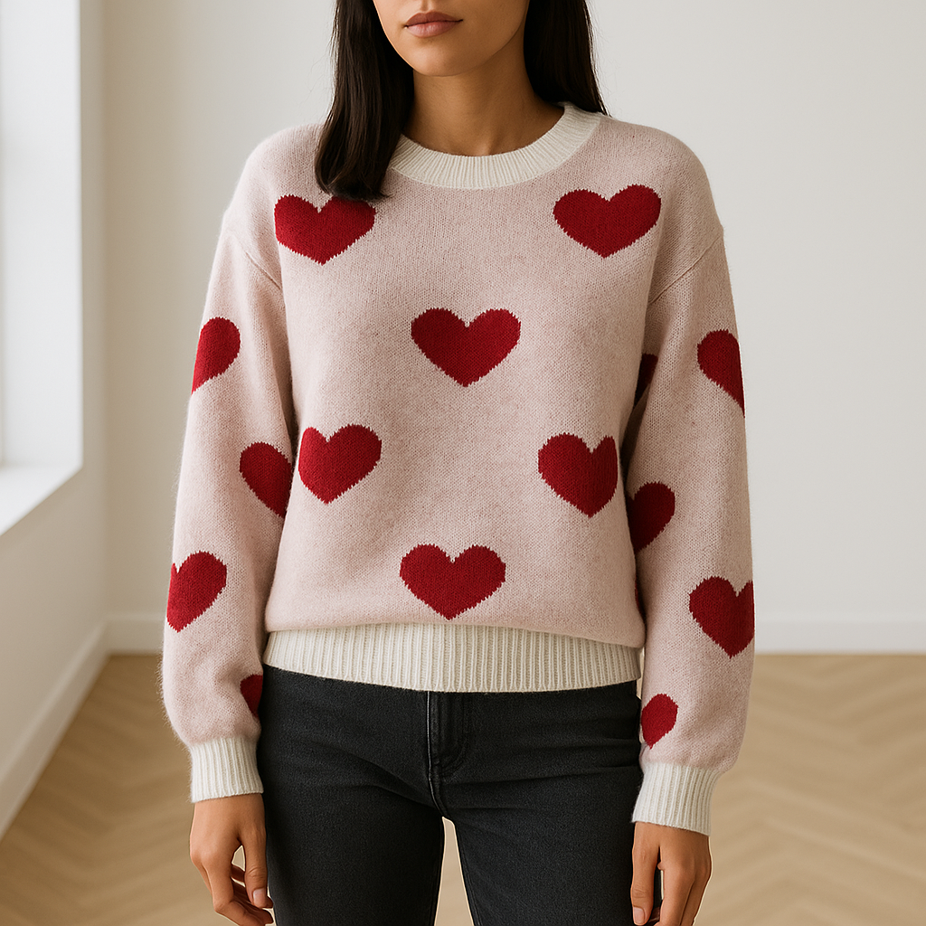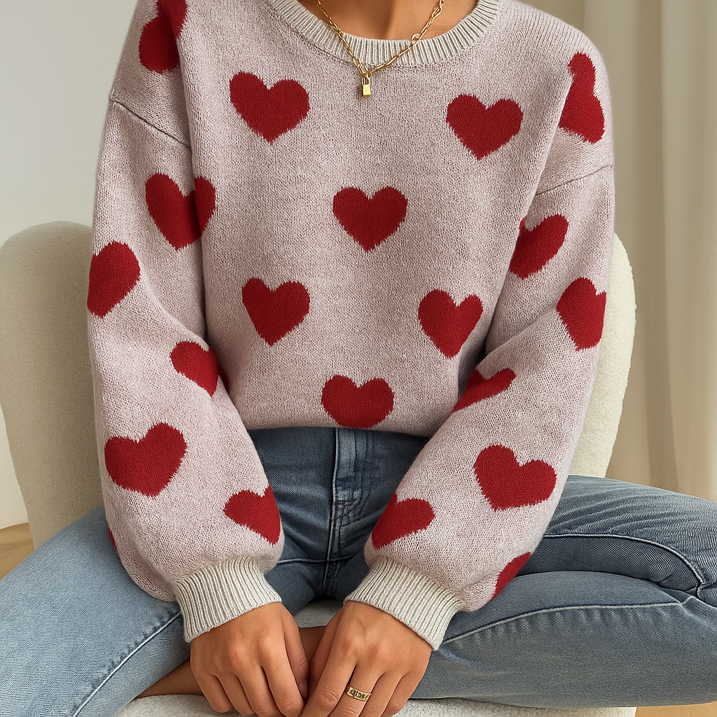 De Zariah trui brengt comfort en stijl samen in een charmant design. Met zijn schattige hartjespatroon en zachte pasvorm voegt hij een vrolijke en warme uitstraling toe aan elke outfit. Ideaal voor ontspannen dagen thuis of casual uitstapjes, deze trui geeft je look een unieke en speelse touch.